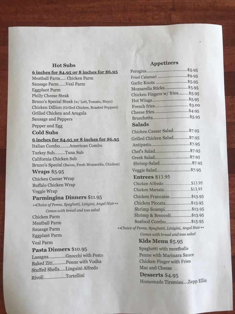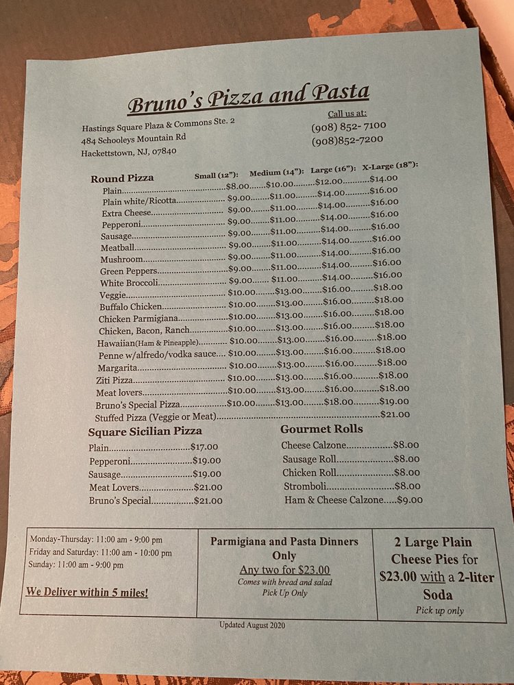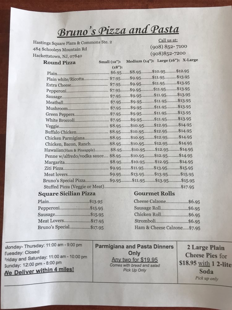 Bruno’s Pizza offers a variety of delicious options with a focus on pizzas, cold subs, hot subs, and wraps. Their menu includes vegetarian options, making it a great choice for all preferences. Located in Hackettstown, NJ, this restaurant also offers street parking and TVs for a comfortable dining experience. Some of the standout items on the menu include the Bruno's Special Steak sub, Buffalo Chicken Wrap, and California Chicken Sub. The diverse selection ensures there is something for everyone to enjoy. Whether you're looking for a classic pizza or a unique wrap, Bruno’s Pizza has you covered. Stop by or call (908) 852-7100 to experience the flavorful dishes for yourself.